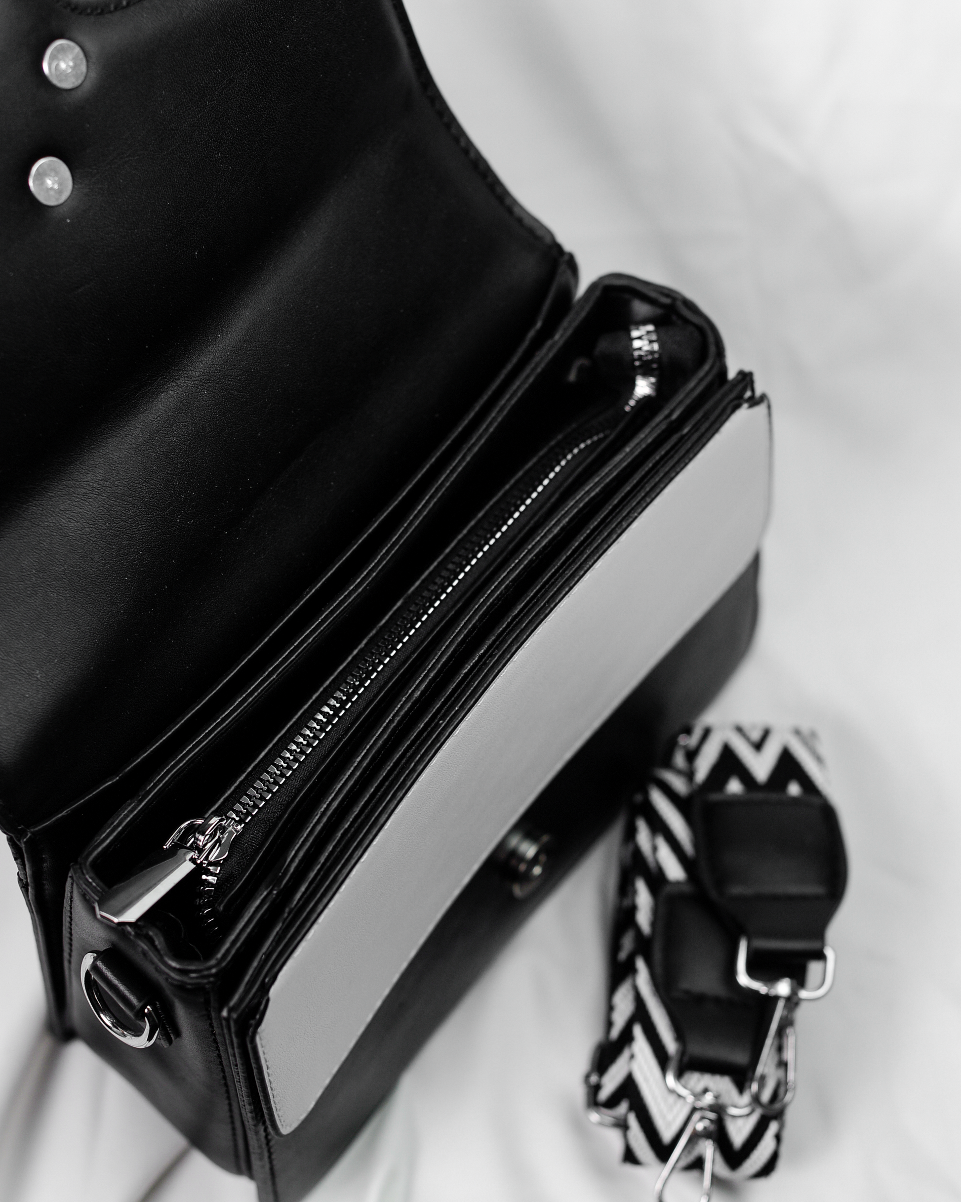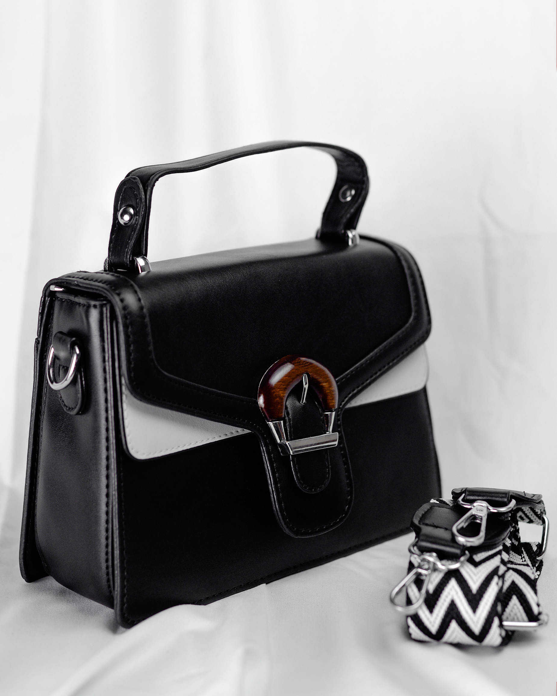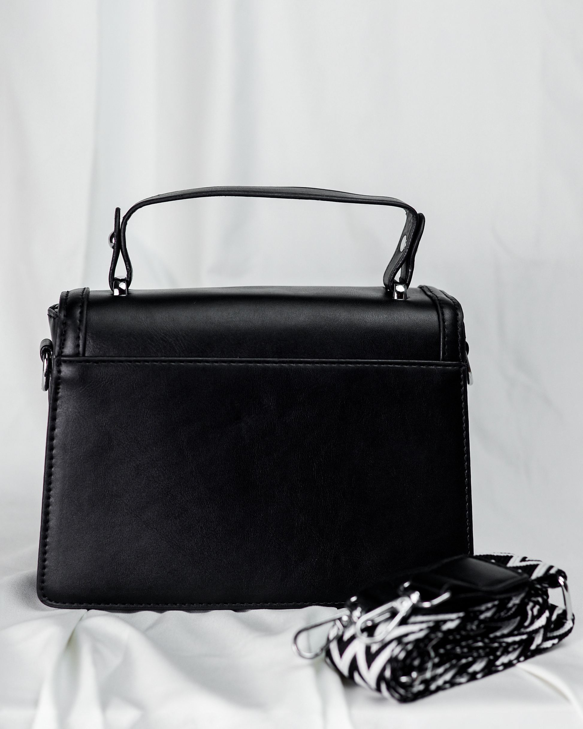 Designed for versatility, it features a sturdy top handle and a detachable patterned shoulder strap, making it perfect for workdays, evenings, and formal occasions. A classic black handbag that pairs effortlessly with every outfit.